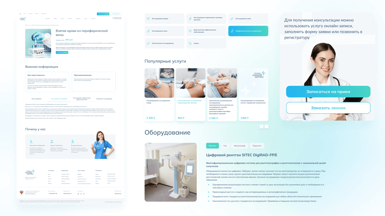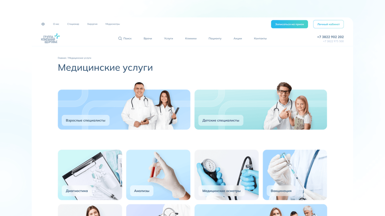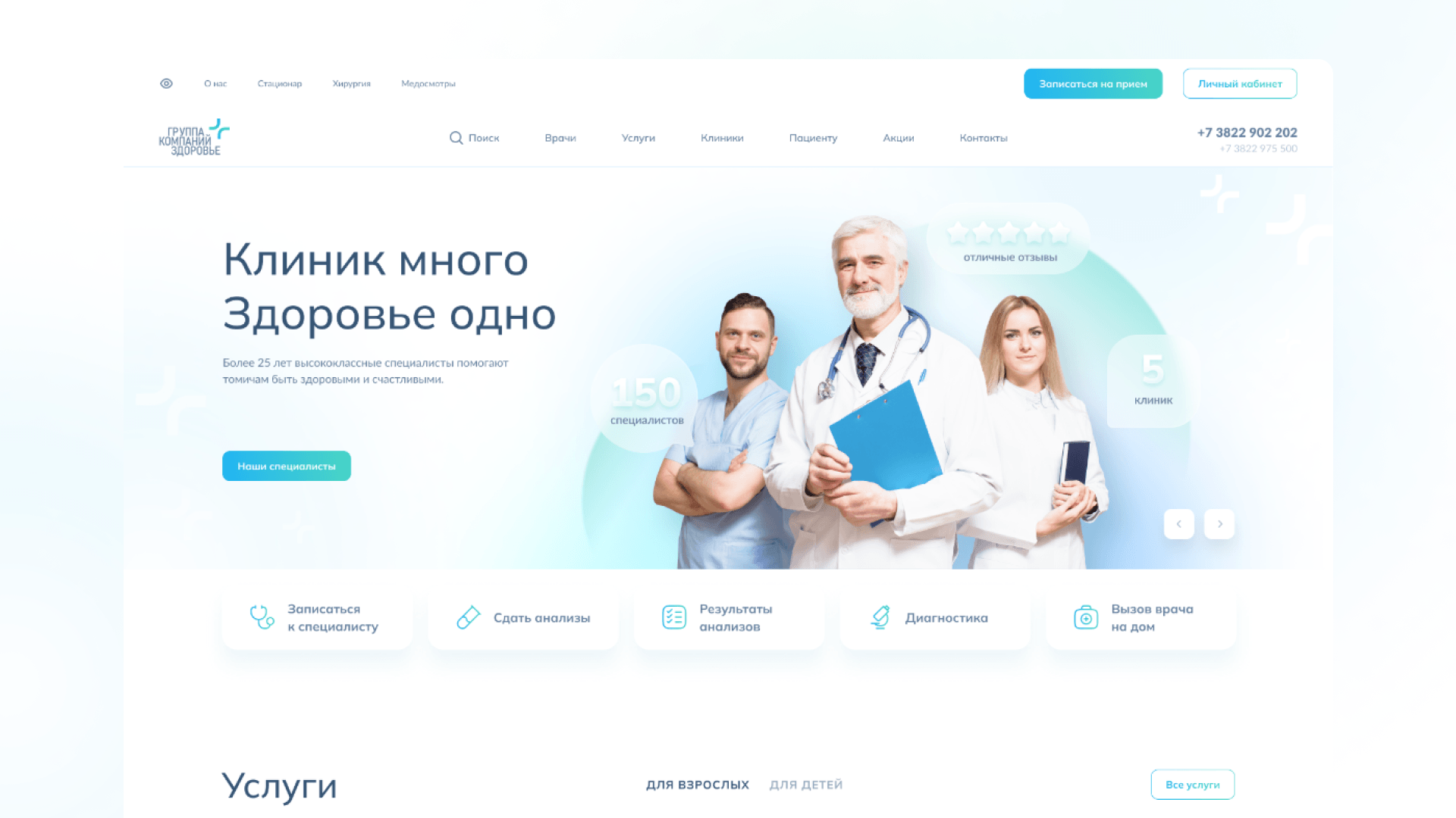 Создать современный и функциональный веб-сайт для медицинской организации, который бы обеспечивал удобный доступ к информации и онлайн-записи для его пользователей. Сайт должен был стать эффективным инструментом как для пациентов, так и для сотрудников нескольких клиник медицинского объединения, с возможностями для быстрого получения информации о медицинских услугах, врачах и записи на прием.