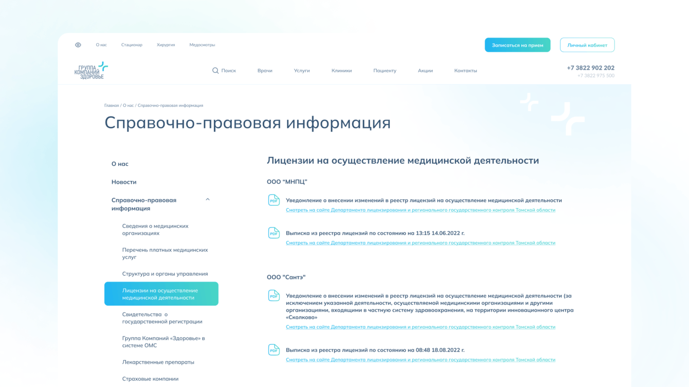 Результатом проекта стал современный, функциональный и удобный сайт, полностью соответствующий законодательным требованиям. Он обеспечивает интуитивно понятный доступ к информации для пациентов, упрощает процесс записи на прием и взаимодействие с клиниками. Благодаря интеграции с МИС и адаптивному дизайну, сайт стал эффективным инструментом как для пользователей, так и для сотрудников медицинской организации, улучшив внутренние процессы и снизив нагрузку на call-центр.
