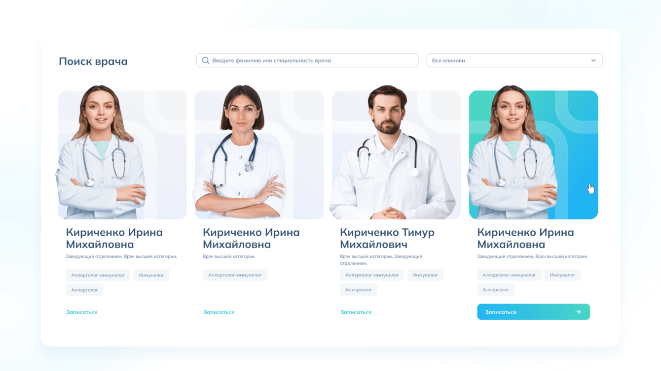 В качестве визуального акцента на странице мы применили динамичный эффект на карточках специалистов: при наведении они плавно окрашиваются, что делает процесс выбора врача более интерактивным и удобным.